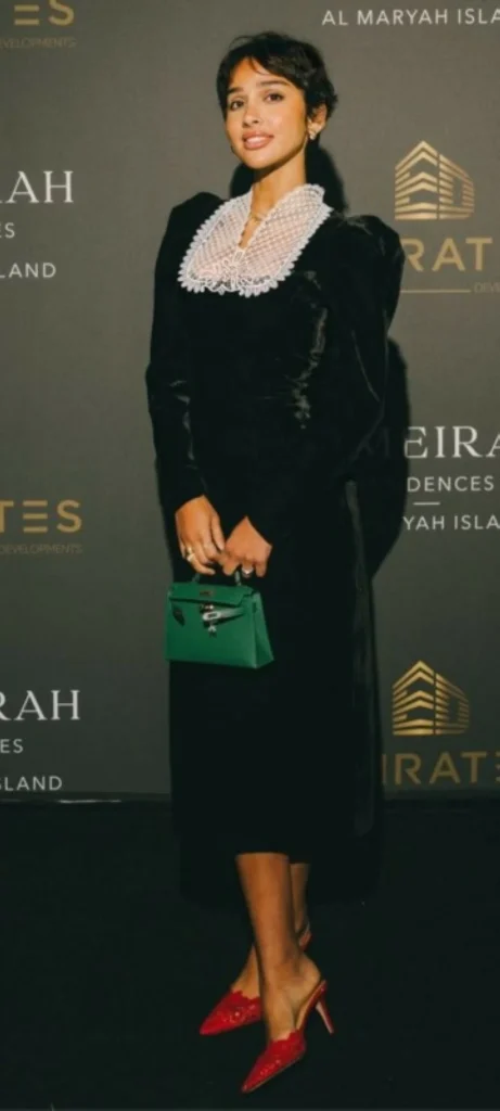 Hala Al-Harithi appeared in a simple black velvet dress, characterized by a soft cut and a white lace collar that added a delicate feminine touch to the look. The dress reflected a calm classic taste, relying on luxurious fabrics and intricate details away from complexity.