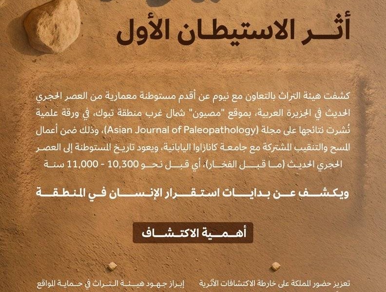 هذا الاكتشاف الرائع جاء نتيجة أعمال التنقيب الأثري التي تنفذها الهيئة بالشراكة مع جامعة “كانازاوا” اليابانية وبتعاون مثمر مع نيوم في موقع “مصيون” شمال غرب مدينة تبوك. ويعود تاريخ هذه المستوطنة إلى العصر الحجري الحديث ما قبل الفخار، وتحديدًا إلى الفترة بين 11000 و10300 سنة من الوقت الحاضر.