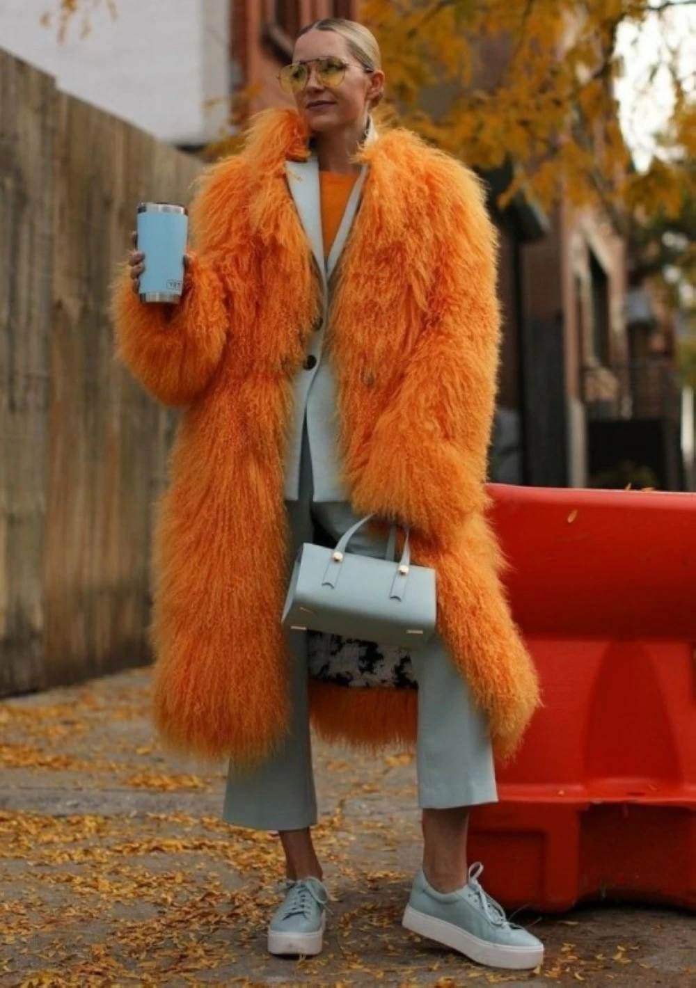 الفرو البرتقالي يُعد خياراً جريئاً في عالم الموضة، ويعكس شخصية قوية وثقة عالية عند تنسيقه بشكل مميز، ويمنح الإطلالة بعداً حيوياً وجاذبية لافتة. يمكن تنسيقه مع ألوان حيادية كالأسود أو الأبيض لإبراز لونه الحيوي من دون إغراق المظهر بالتباين المبالغ فيه، كما يمكن دمجه مع قطع مونوكروم متقاربة في درجاتها لإضفاء توازن بصري يحافظ على جرأته دون فقدان الرقي.