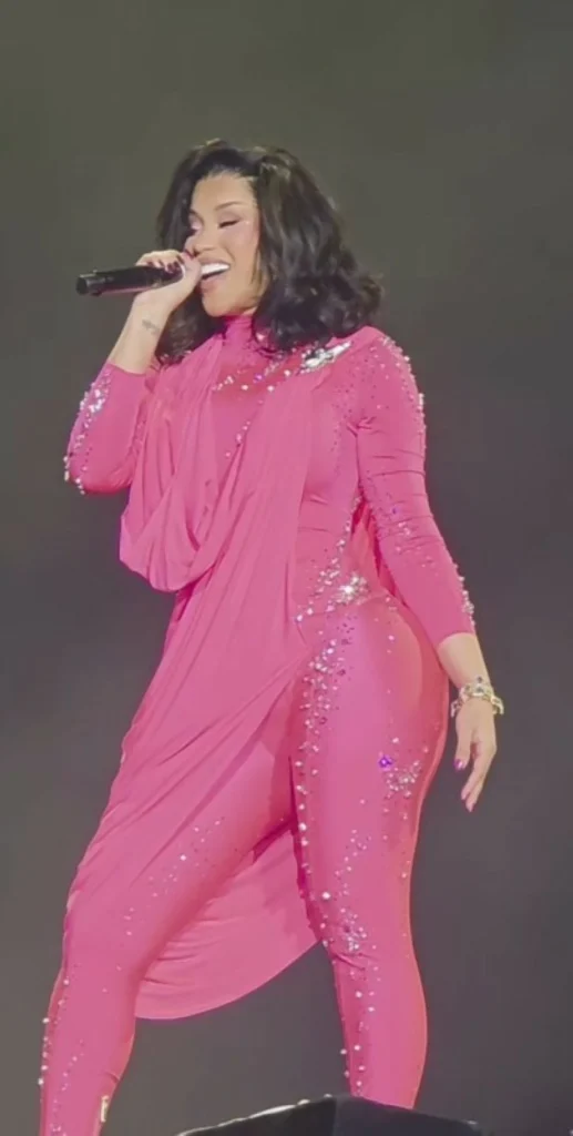 The piece Cardi B wore was in a striking fuchsia color that reflects clear boldness and a strong theatrical presence suitable for live performances. The design relied on a flexible fabric that hugs the body fluidly, with shiny embroidery carefully scattered throughout the piece, adding a dynamic visual dimension that interacts with the stage lighting and enhances the strength and vibrancy of the color.