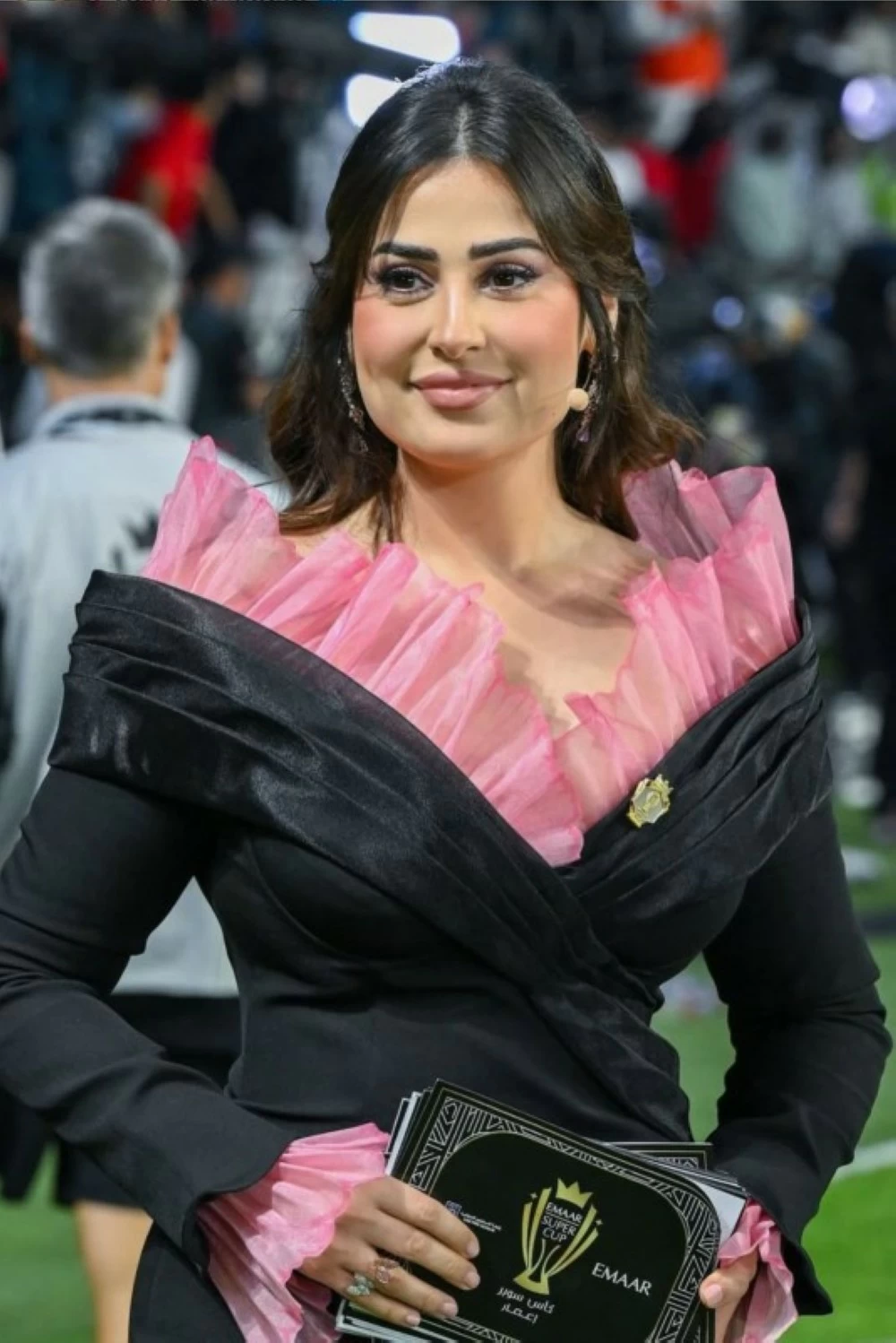 The media personality Roua Al-Sabban made an elegant appearance characterized by simplicity with a striking feminine touch, as she chose a fitted black dress that highlighted her graceful figure, adorned with soft pink ruffles around the shoulders and wrists, adding a light romantic dimension to the look and breaking the intensity of the black color in a refined and understated manner.