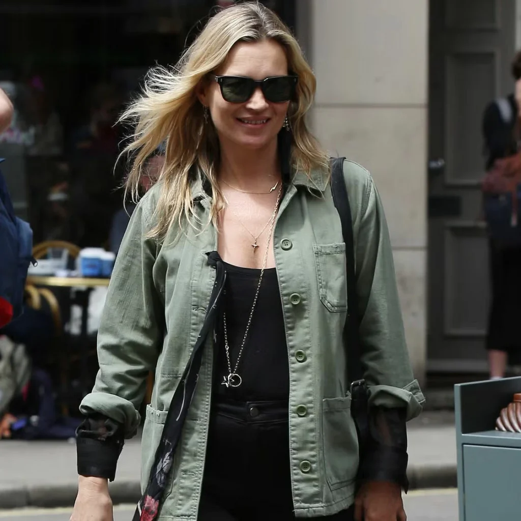 The look relied on coordinating the khaki jacket with basic everyday pieces like jeans and simple shoes, a style that reflects Kate Moss’s fashion philosophy based on spontaneity and avoiding excess, making classic pieces the focus of the look instead of accessories or extra details.