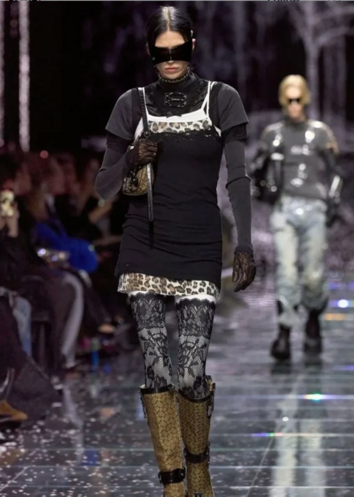 Global star Kim Kardashian posted a new picture of herself across her accounts, in which she appeared wearing an outfit from Balenciaga, which was exactly identical to the look presented on the runway without any changes or re-styling. The look reflected the brand’s vision as it is, with a clear reliance on the deliberate layering style and the tight cuts that highlight the figure, alongside lace materials, sheer fabrics, and animal prints, which are elements that formed the identity of the collection.