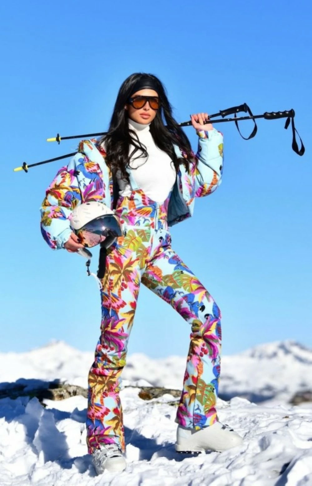 Lama Al-Aqeel caught attention with an unconventional skiing look, choosing an outfit in bright summer colors, which created an attractive contrast with the winter atmosphere, reflecting her boldness, high fashion sense, and ability to break traditional rules.