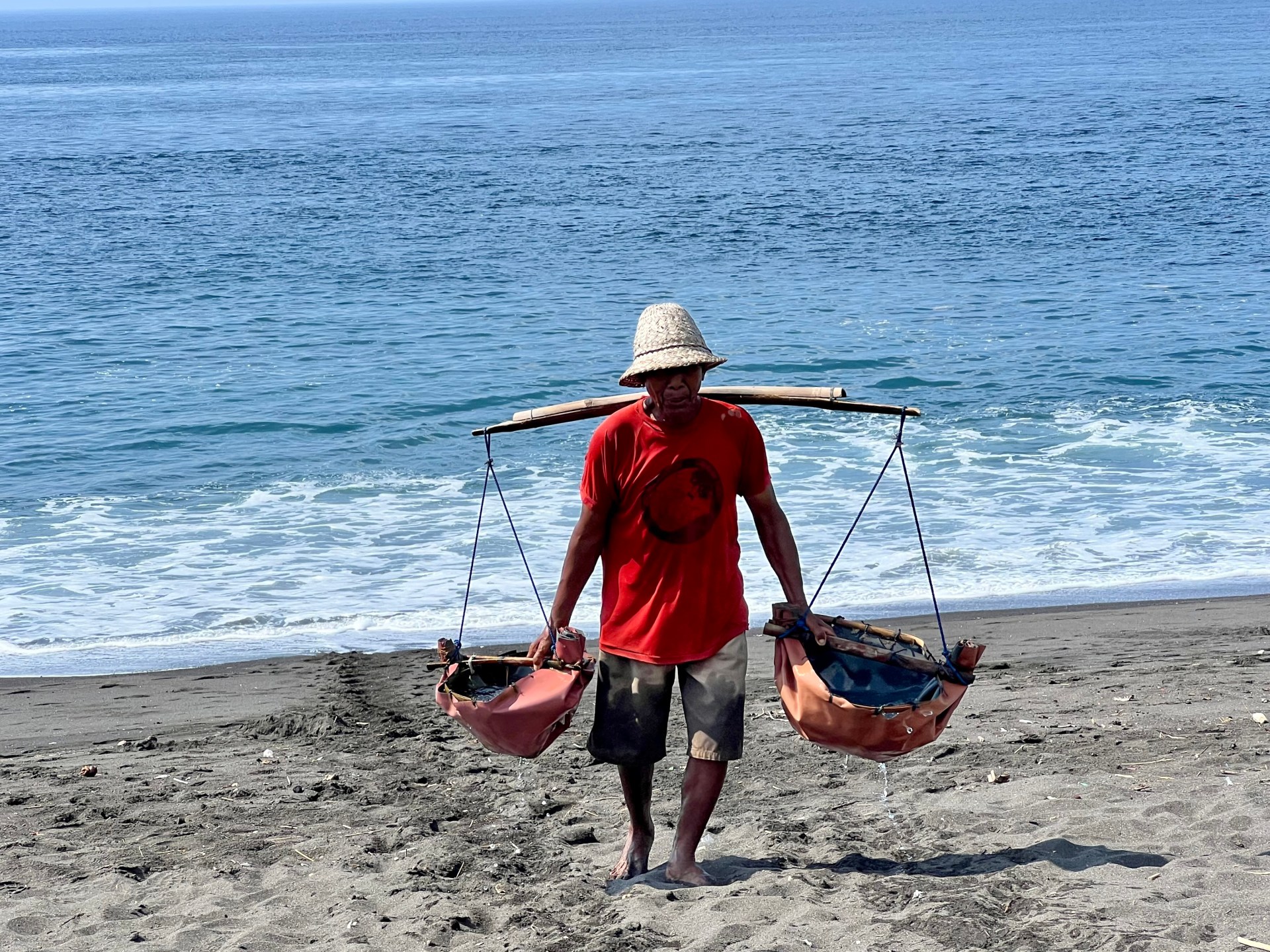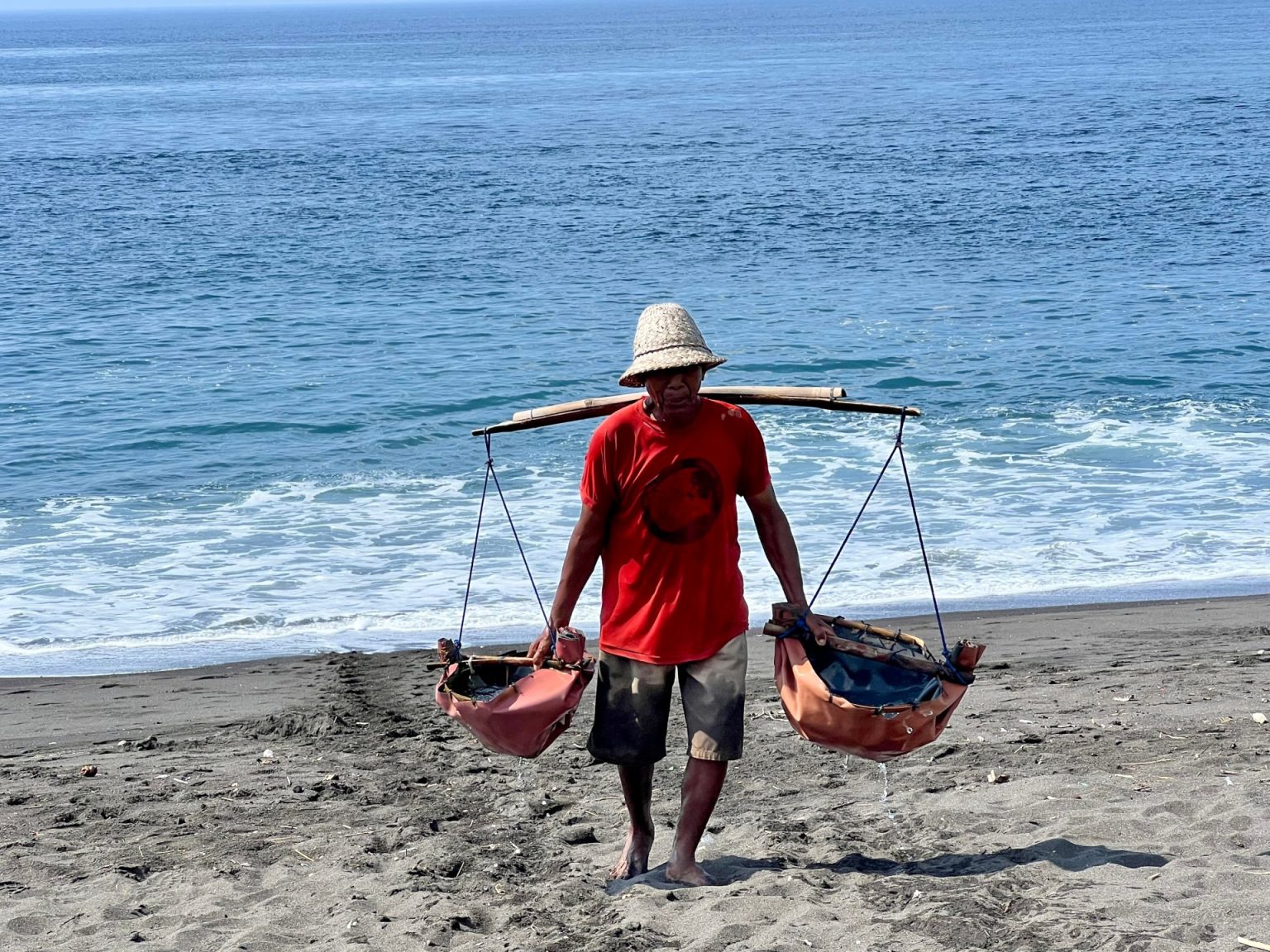 يحمل نيومان وارتا بمشقة ودأب مياه البحر داخل حاويتين بسيطتين، إلى شاطئ قرية كوسامبا الساحلية الكائنة في جزيرة بالي بإندونيسيا. فوفقا للتقاليد المتوارثة أبا عن جد، يجعل وارتا الحاويتين متوازنتين في أثناء حملهما، بتعليقهما على مسافة محددة على عمود يستقر بقوة عبر كتفيه، ثم يصب المحتويات بعناية فائقة على الرمال الداكنة.