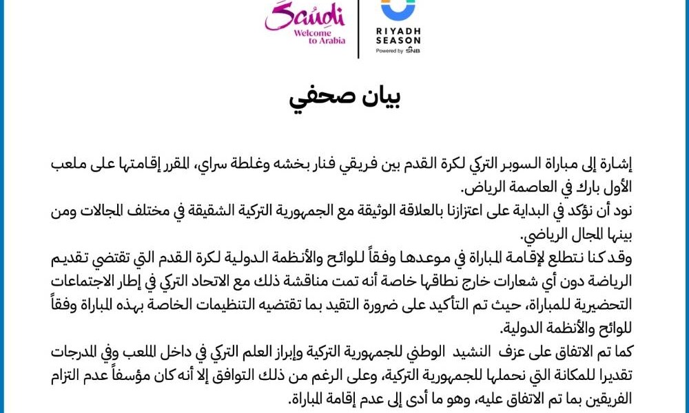 أصدر موسم الرياض عبر حسابه على منصة X بياناً صحفياً يخص مباراة السوبر التركي لكرة القدم بين فريقي فنار بخشة وغلطة سراي، جاء على النحو الآتي: