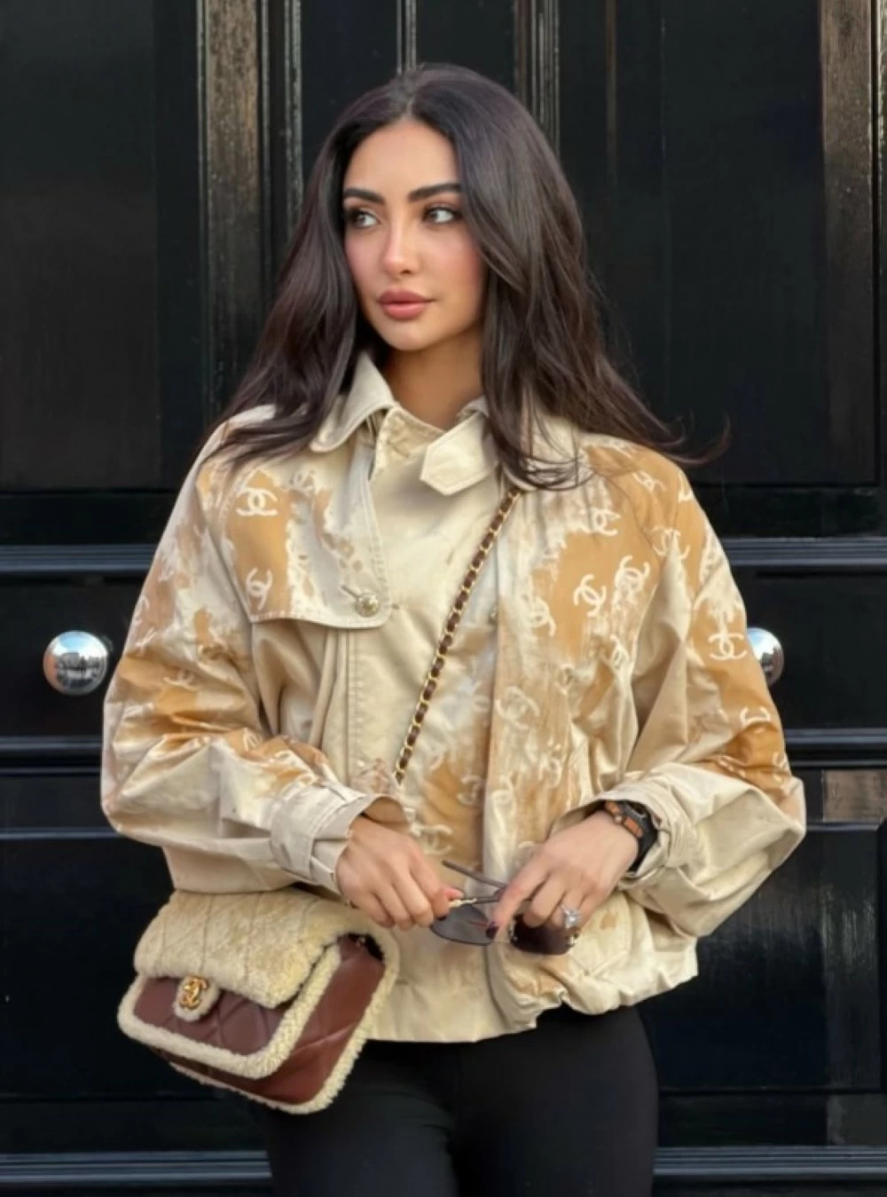 The star Nour Al-Ghandour appeared in her latest look with an elegant and complete ensemble from Chanel, reflecting her refined taste and ability to blend practical pieces with luxurious touches. The look centered around beige rain boots, which served as a striking and bold element, combining practicality with the upscale identity of the French house.