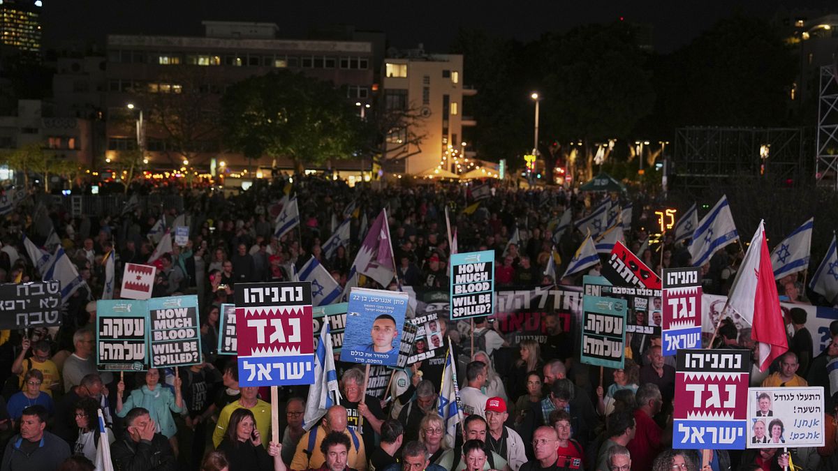 شهدت تل أبيب، مساء الاثنين، تظاهرة ضد رئيس الوزراء الإسرائيلي بنيامين نتنياهو وحكومته، تنديدا بإقالة قادة أمنيين، ومسؤولين قانونيين كبارا، واستئناف الحرب في غزة.