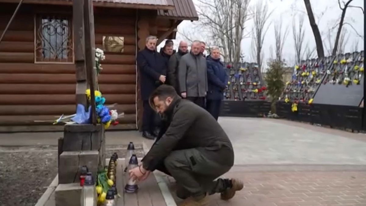 تقدم الرئيس الأوكراني فولوديمير زيلينسكي مراسم إحياء ذكرى سقوط أكثر من 100 قتيل خلال الثورة ضد سياسات الرئيس السابق فيكتور يانوكوفيتش الموالي لروسيا.