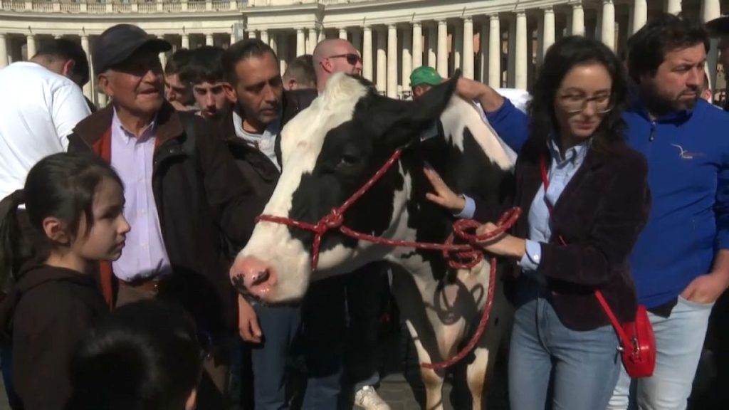 على طول الشارع الذي يربط ساحة القديس بطرس بقلعة غاندولفو، جرّ المزارعون بقرة تدعى “إركولينا 2″، أيقونة الاحتجاج الذي قاموا به خلال الأسابيع الماضية.
