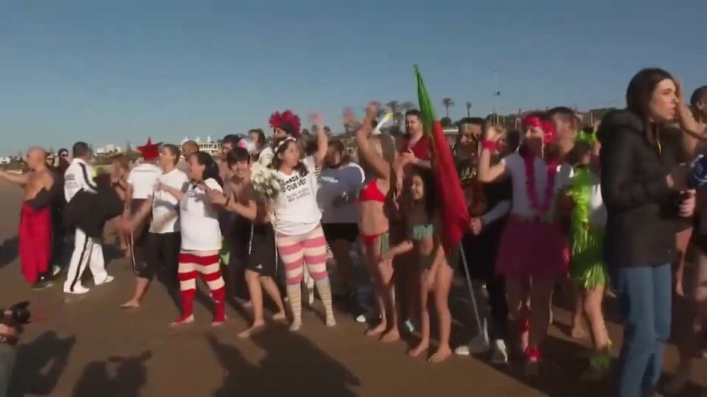 تجمع حوالي 100 شخص على شاطئ كاركافيلوس بالقرب من لشبونة للاحتفال ببداية العام الجديد بالسباحة في البحر يوم الإثنين.