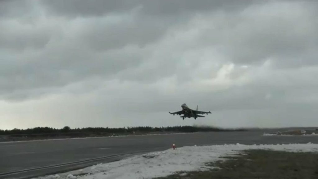 ونشرت وزارة الدفاع الروسية مشاهد مصورة لطائرات من طراز سوخوي 34 و35 وهي تقلع من مطار قريب من الحدود مع أوكرانيا، مشيرة إلى أنها قصفت مركز عمليات في مدينة كوبيانسك الأوكرانية.