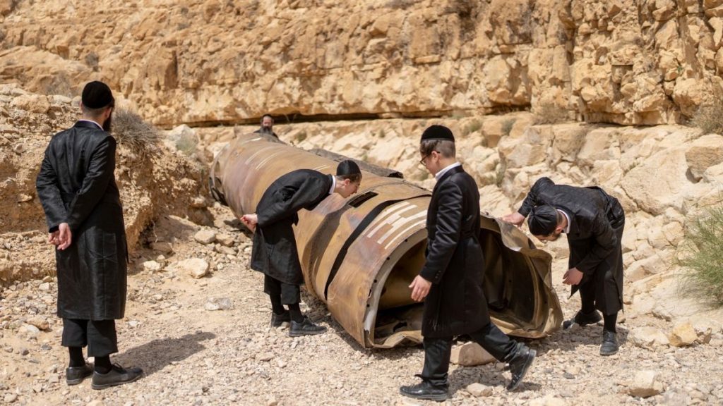 أظهرت مشاهد مصورة، عائلات يهودية متشددة، وهي تتفقد يوم الأحد حطام ما يعتقد أنه صاروخ أرض-أرض إيراني تم اعتراضه خلال الهجوم الذي نفذته طهران، واستهدف تل أبيب مساء 13 أبريل 2024.