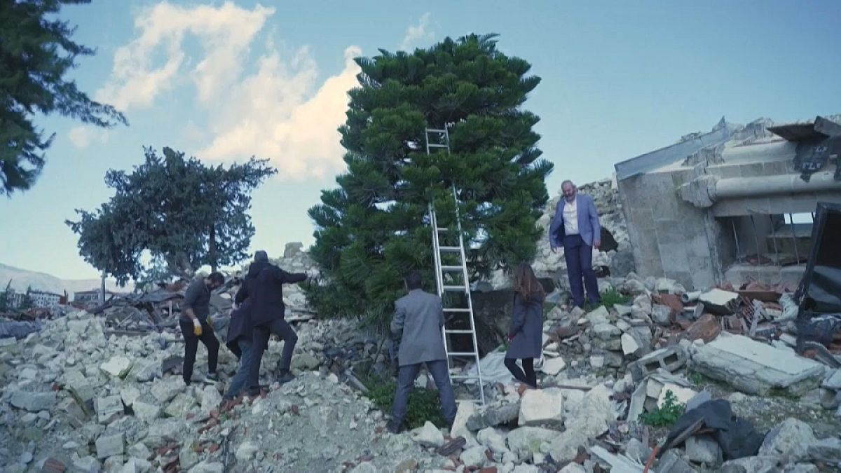 تقف شجرة صنوبر كبيرة ثابتة فوق الأنقاض، وهي الأثر الوحيد المتبقي من مبنى الكنيسة الأرثوذكسية في أنطاكيا بعدما دمره الزلزال العنيف الذي ضرب جنوب تركيا في 6 شباط/فبراير.