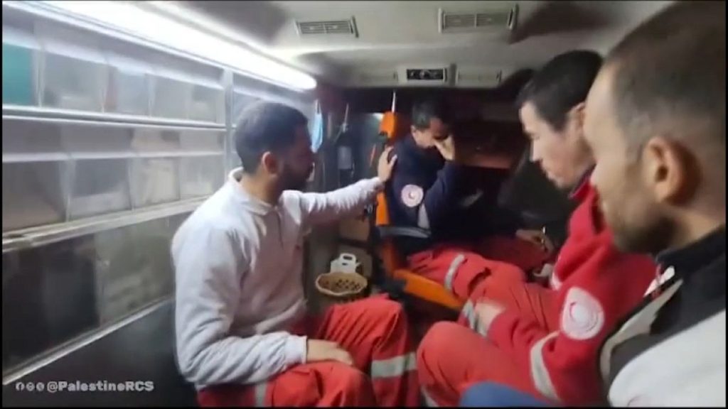 التقطت عدسات الكاميرا لحظة إبلاغ مسعف من جمعية الهلال الأحمر الفلسطيني بخبر وفاة ابنه نتيجة الغارات الإسرائيلية على قطاع غزة.