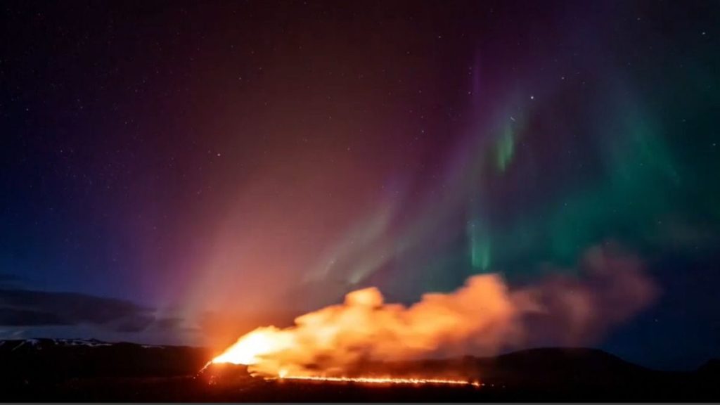 أظهر مقطع فيديو بفواصل زمنية متتابعة أضواء الشفق القطبي وهي تتلألأ في السماء، فوق بركان في غريندافيك جنوب غرب آيسلندا، حيث ثار البركان ثار أربع مرات في الأشهر الأخيرة مرسلًا الحمم البركانية، وهو مستمر في الثوران لكن نشاطه يتضاءل ببطء. وأصبح الثوران الحالي للبركان، المستمر الآن لمدة 28 يومًا، ثاني أطول ثوران رسمي من بين السبعة التي حدثت في السنوات الثلاث الماضية، بعد ثوران بركان فاغرادالسفجال الذي استمر ستة أشهر في عام 2021. وتثور فوهة بركان واحدة فقط في الوقت الحالي وينحصر تدفق الحمم النشطة بعيدًا عن أي بنية تحتية.