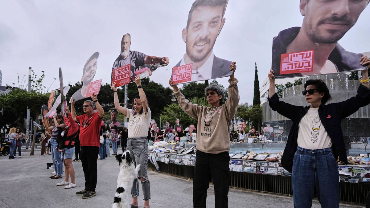 في ساحة ديزنغوف بتل أبيب، رفع أفراد عائلات الرهائن الحاليين صور أحبائهم فيما دوّت صفارات الإنذار.
