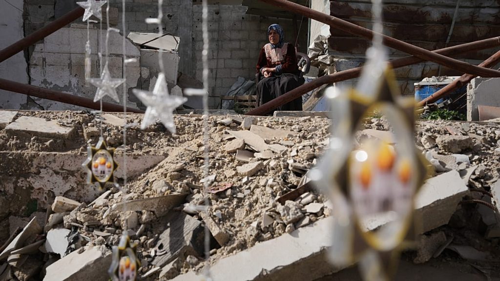 في مخيم خان يونس، أحد أكثر المناطق تضررًا، يحاول متطوعون التحرك بحذر بين الركام لتعليق خيوط زينة حمراء تمتد من شرفة مدمّرة إلى أخرى. وعلى لوح إسمنتي وسط الأنقاض، يغمس الخطاط والفنان هاني دهمان فرشاته في الطلاء، ويخط بعناية عبارة “أهلًا رمضان”. يتجمّع الأطفال خلفه، يراقبون حركة الفرشاة بدقة وكأنهم يتمسكون بلحظة فرح نادرة.