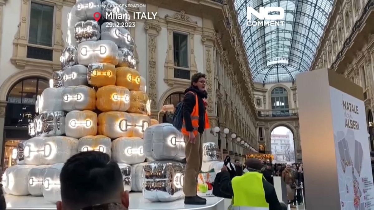 قام أعضاء نشطاء من حركة “الجيل الأخير” برش طلاء قابل للغسل على شجرة عيد الميلاد التي ابتكرتها شركة غوتشي العالمية في سوق للتسوق في وسط مدينة ميلانو يوم الجمعة.