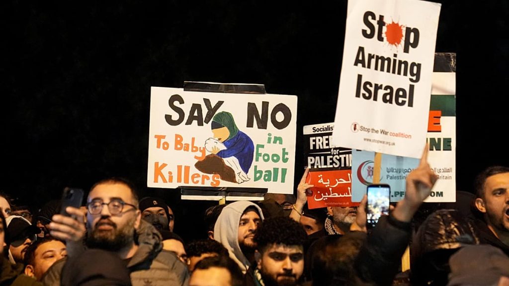 وأوقفت الشرطة مؤقتاً تقدم المتظاهرين بعد أن رُصدت إشارة بعلم إسرائيلي من مارة، وشكلت خطاً بشرى لمنع التصادم. في الوقت نفسه، مرّت خمس سيارات تحمل لوحات إلكترونية متنقلة، عرضت رسائل معارضة لمعاداة السامية، منها: “حظر الكراهية، لا المشجعين”، واقتباس من تييري هنري: “الكرة ليست عن الأهداف، بل عن جمع الناس معاً”.