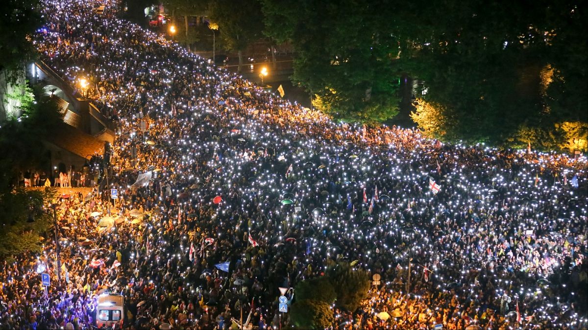 وانضم عشرات الآلاف إلى مسيرة مؤيدة لأوروبا في العاصمة الجورجية يوم السبت، للاحتجاج على مشروع القانون الذي اقترحته الحكومة بشأن إعلان “التأثير الأجنبي”.