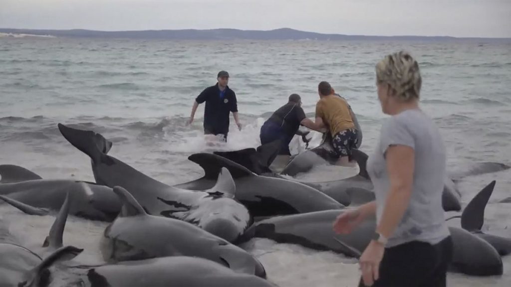 وصل نحو 160 حوتا طويل الزعانف إلى شاطىء الساحل الغربي في أستراليا، ونفق 26 حوتا قبل أن تتمكن سلطات الحياة البرية من انقاذ الباقي وإعادتهم إلى موطنهم الأصلي. ويشير الخبراء إلى أن تغير المناخ، الحالة الصحية أو الإصابة قد يساهم في نفوق الحيتان بهذا العدد.